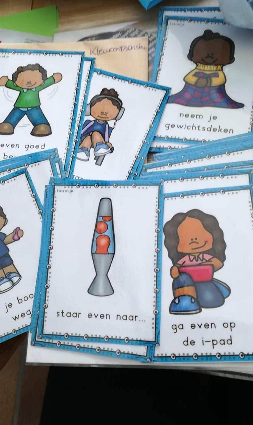 - 26 kaarten in kleur met handelingen die de kinderen helpen terug rustig te worden.
