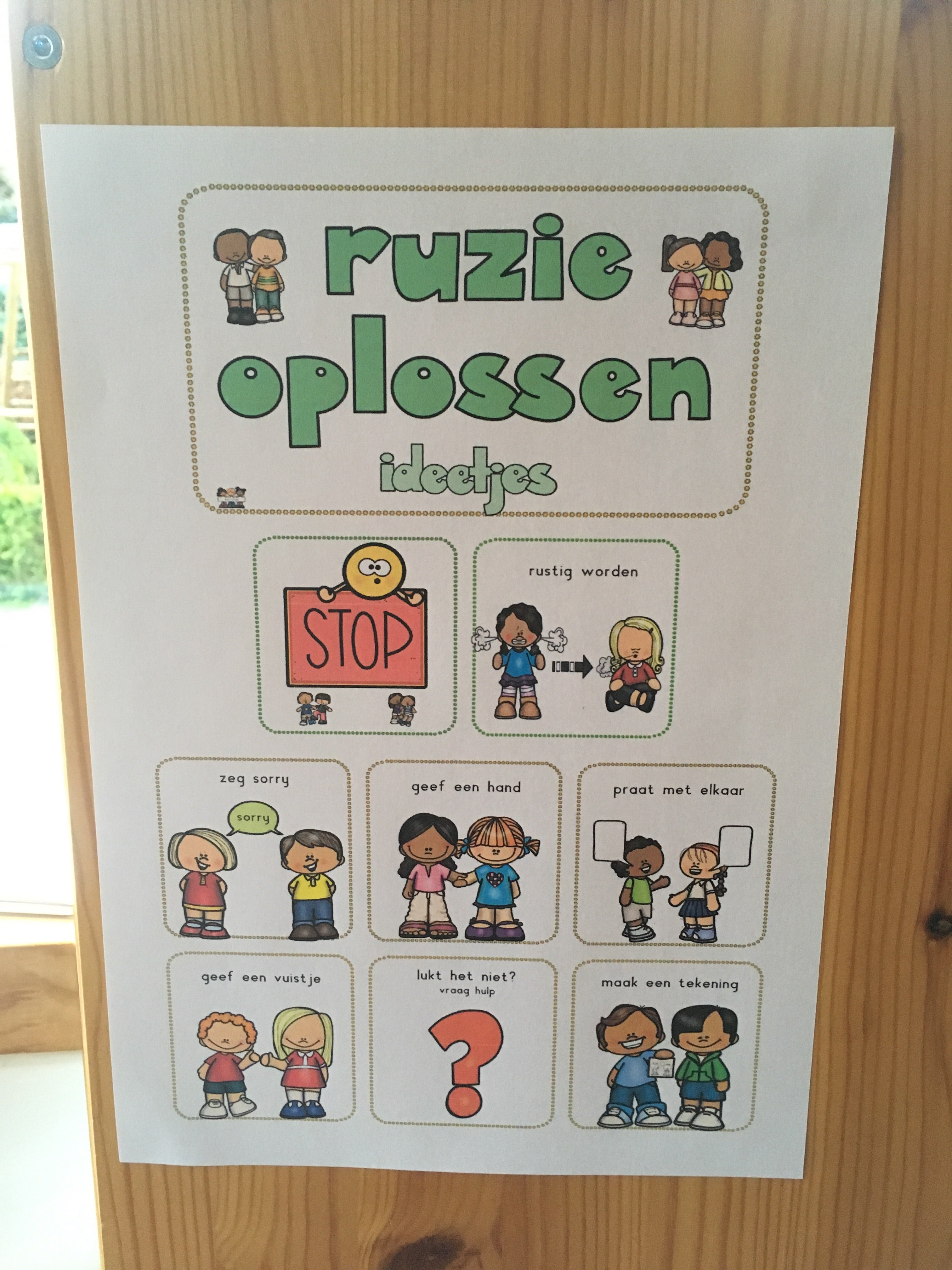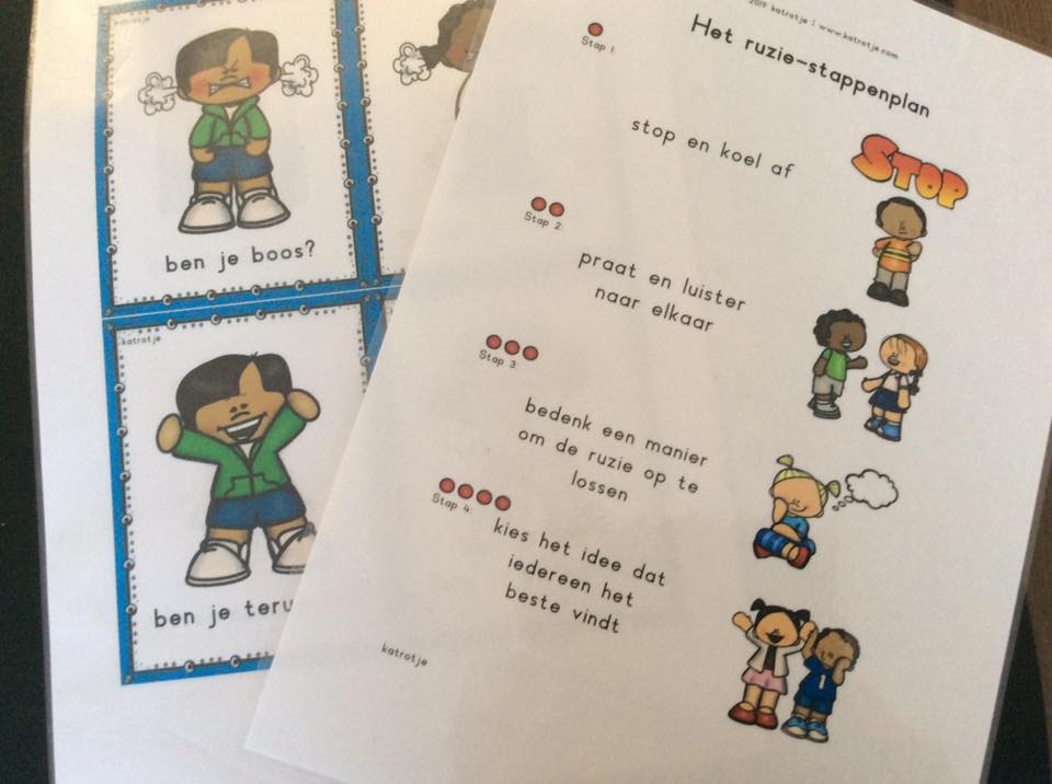 - een poster die de kinderen helpt om tot een oplossing te komen bij een ruzie met keuze uit 16 oplossingen