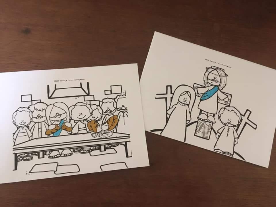 Het Paas verhaal met Jezus en zijn vrienden in kleur en als kleurplaat