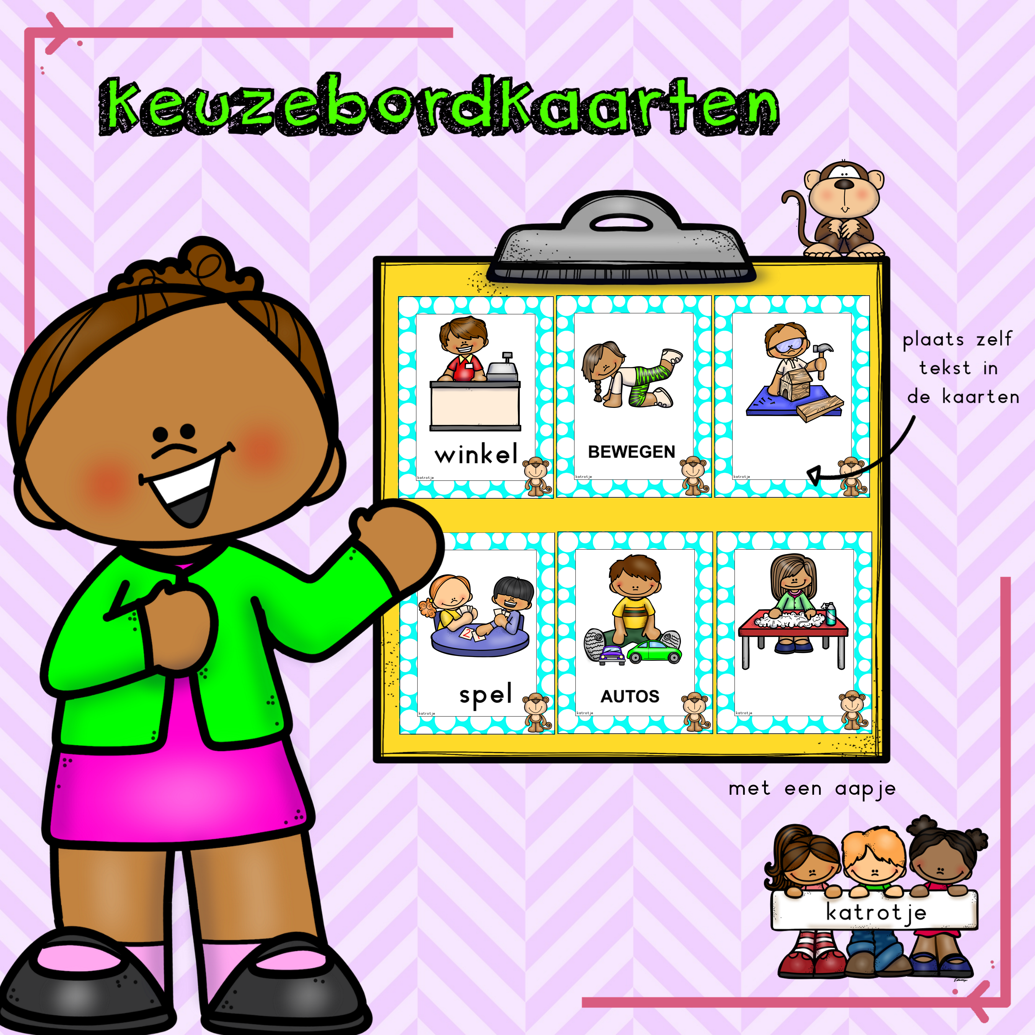 een waaier aan keuzebordkaarten voorzien van een aapje