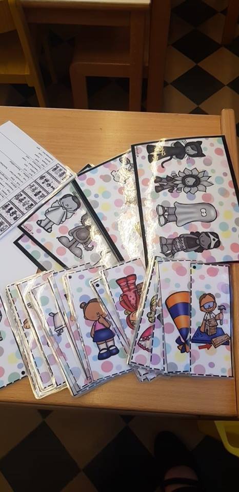 - de nodige rijmkaarten met langs 1 kant het rijmwoord en langs de andere kant een gekleurde afbeelding zoals op de opdrachtkaart