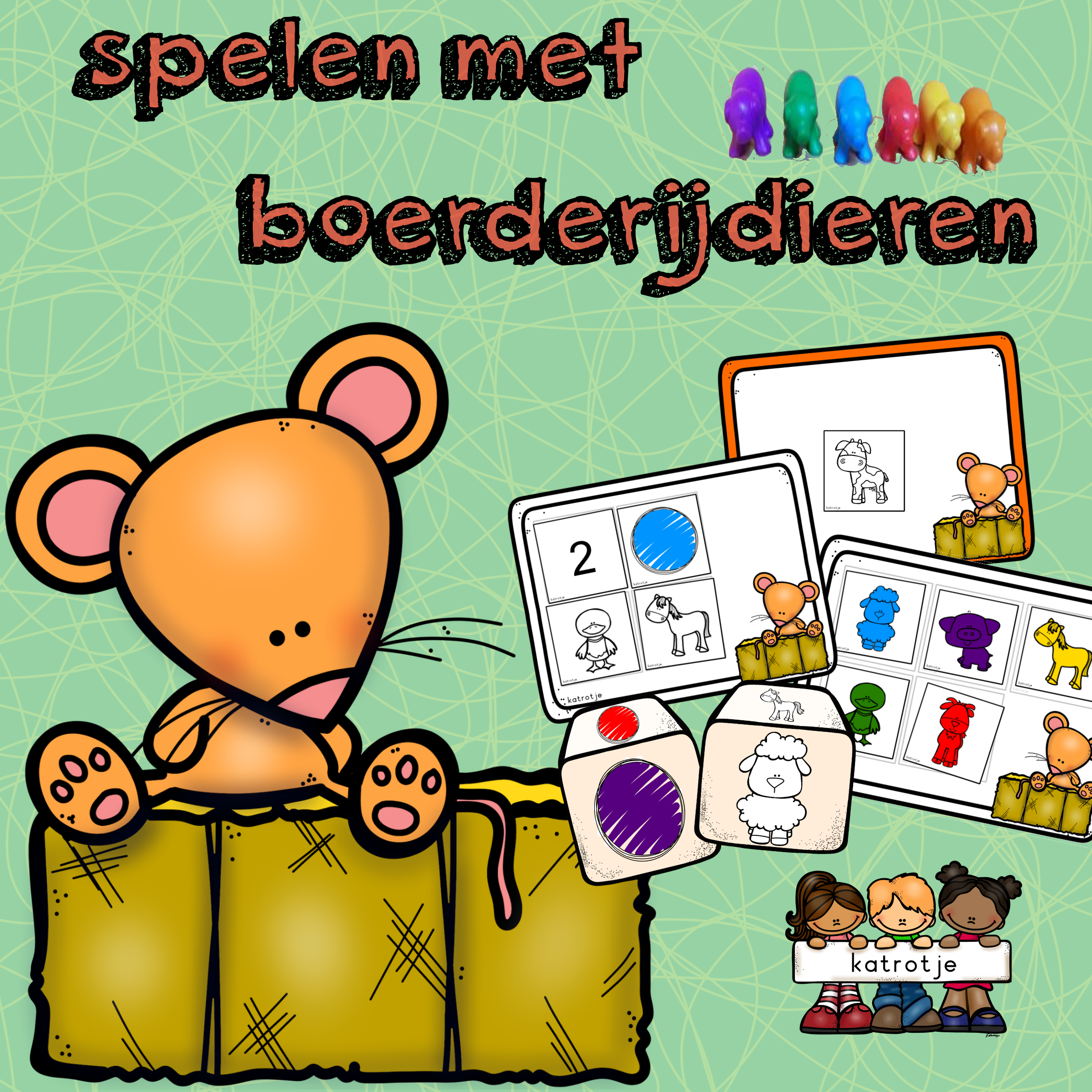 - 3 dobbelstenen (1 met 6 kleuren en 2 met telkens 6 dieren)
