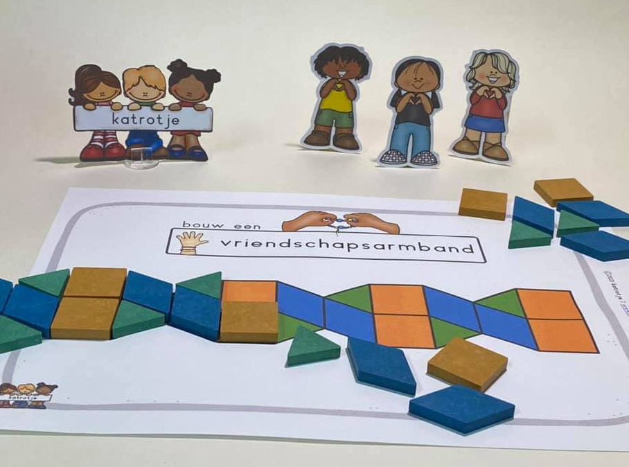 - vriendschapsbandjes maken met patroonblokken (10 in kleur en 10 als tekening)